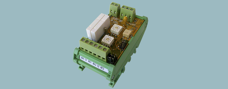 Este dispositivo se alimenta con 24Vdc, y cuenta con dos salidas relé. Ambas tienen los contactos NA y NC disponibles en la bornera de conexionado y se activan al alcanzar al valor de frecuencia seteado por el usuario. La frecuencia de alarma deseada se configura mediante un interruptor rotativo con el que se define el rango y un potenciómetro de ajuste fino.